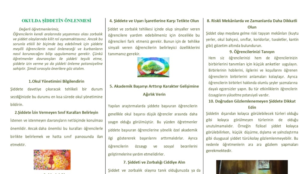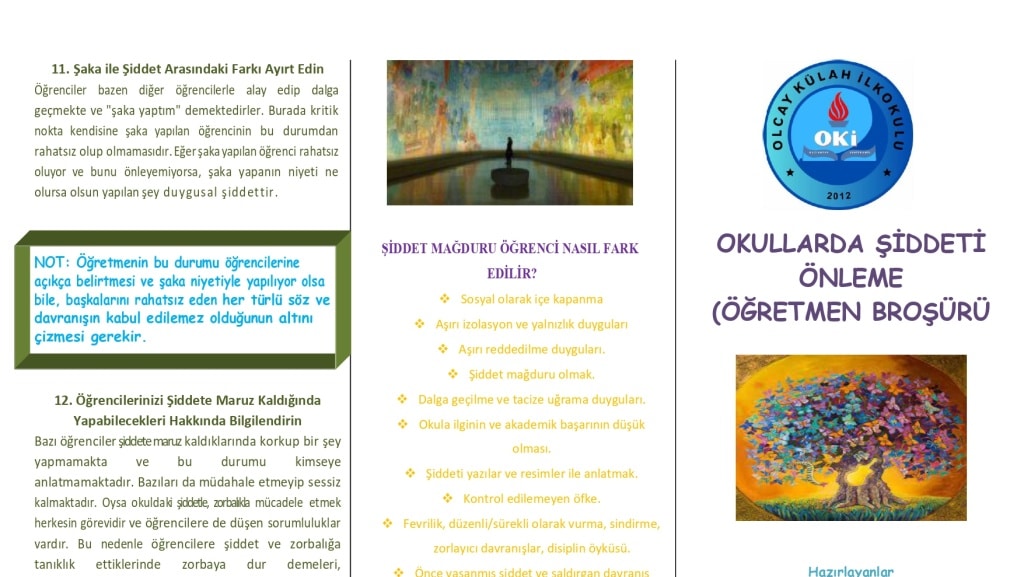 Okulumuz rehberlik servisi tarafından okulumuz öğretmenlerine yönelik Okullarda Şiddeti Önleme konulu öğretmen broşürü hazırlanmıştır. Okullarda Şiddeti Önleme konulu öğretmen broşürü, öğrencilerin şiddet ve zorbalık davranışlarını önlemek, yaşanılan olumsuz durumları doğru yönetmek amacıyla hazırlanmıştır.